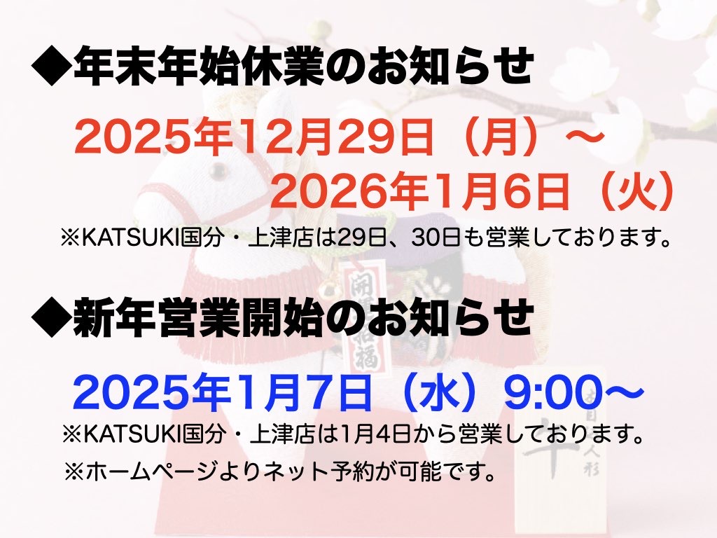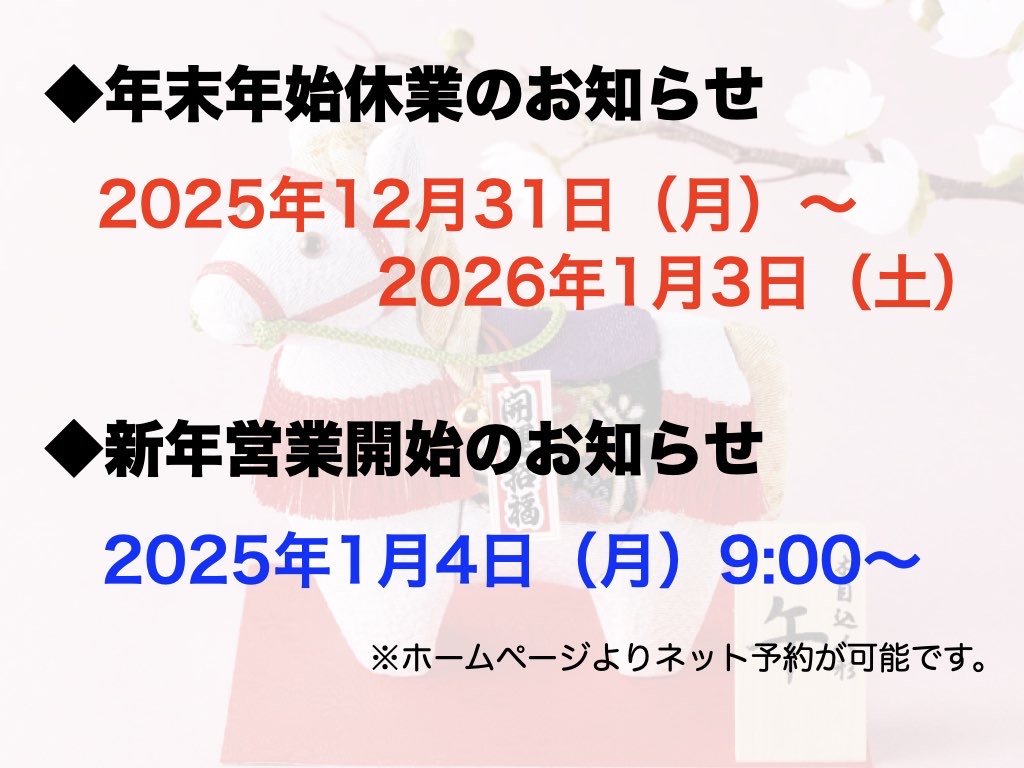 少し早いですが年末年始営業日についてのお知らせになります🙇