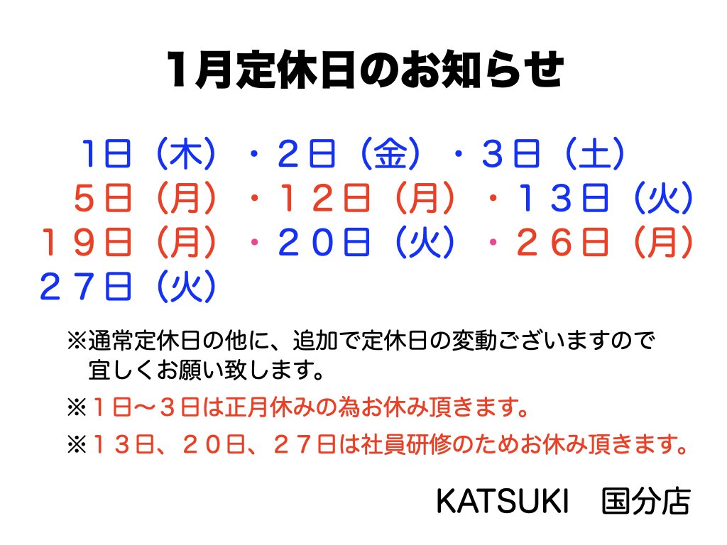 国分店の1月の定休日変更のお知らせをさせて頂きます。